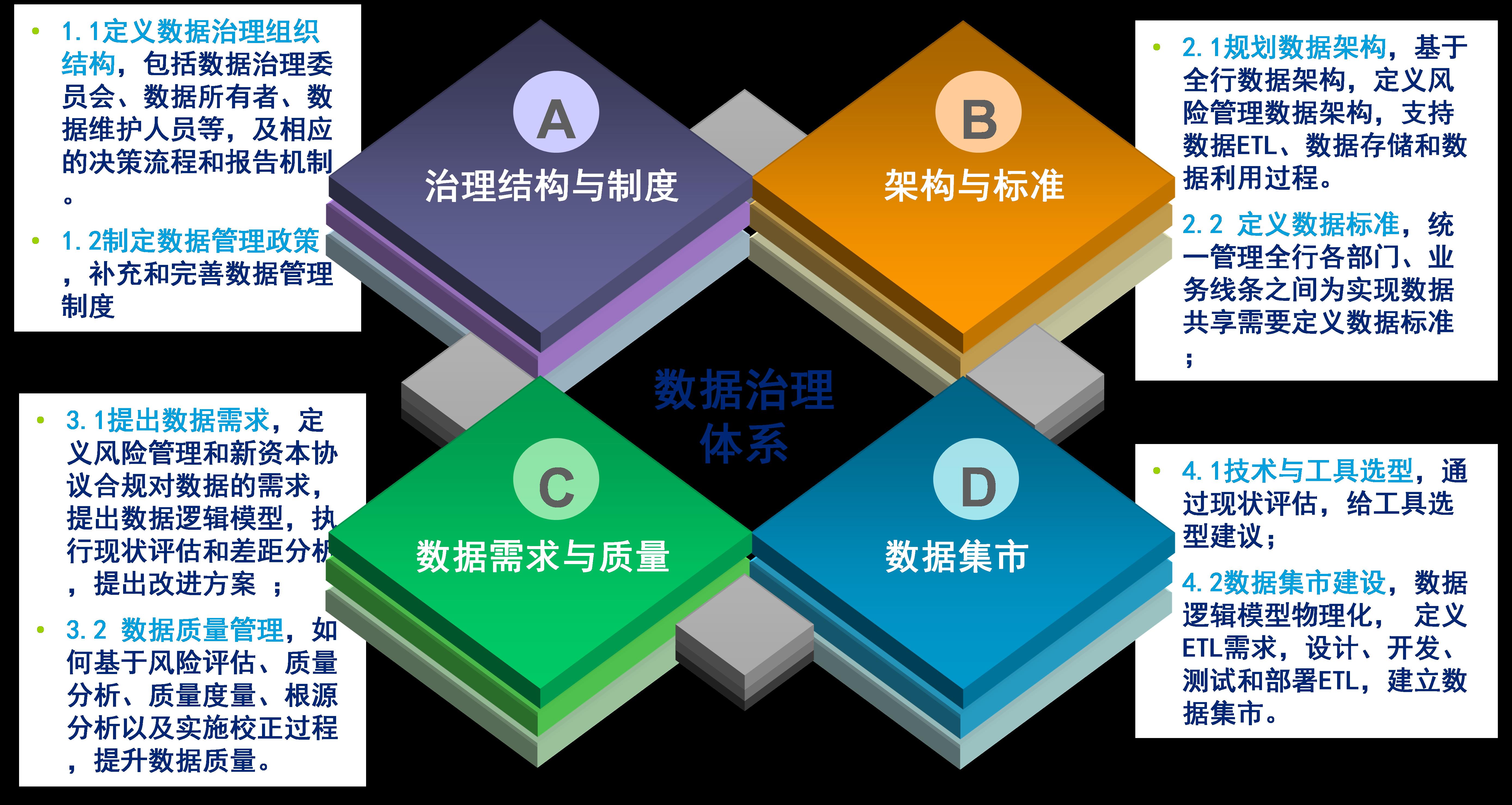 工作目標:建立并細化全行數據標準,對現有數據進行科學質量提升,建立長期的數據收集、整理、質量監督、提升的流程。建立先進的數據和IT治理體系,統一規劃、理清風險邊界和關系。在業務系統、數據平臺、數據風險集市和風險管理系統四個層面上保障信息安全。
